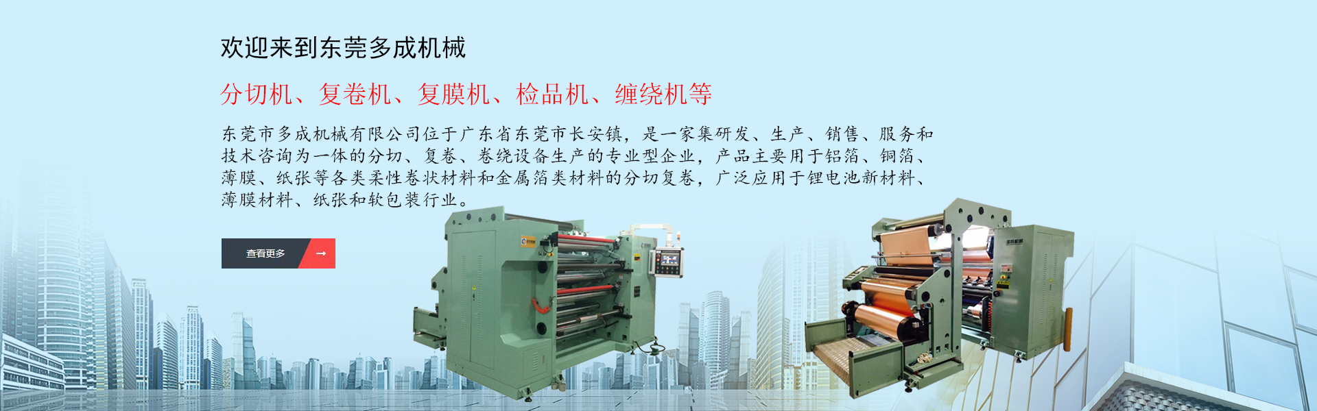 東莞市多成機械有限公司位于廣東省東莞市長安鎮,是一家集研發、生產、銷售、服務和技術咨詢為一體的分切、復卷、卷繞設備生產的專業型企業,產品主要用于鋁箔、銅箔、薄膜、紙張等各類柔性卷狀材料和金屬箔類材料的分切復卷,廣泛應用于鋰電池新材料、薄膜材料、紙張和軟包裝行業,產品范圍有分切機、復卷機、復膜機、檢品機、纏繞機等,是國內外分切卷繞設備專業供應商。